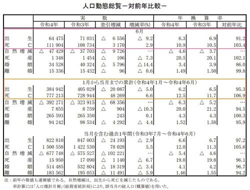 厚生労働省が人口動態統計・速報の2022年6月分を発表していましたので紹介いたします。 出生数は前年同月より -9.2% の6万4475人に留まりました。この数値は推計・低位に近く、2022年上半期の累計出生数は前年より 5% のマイナスです。 「出生数が推計・低…