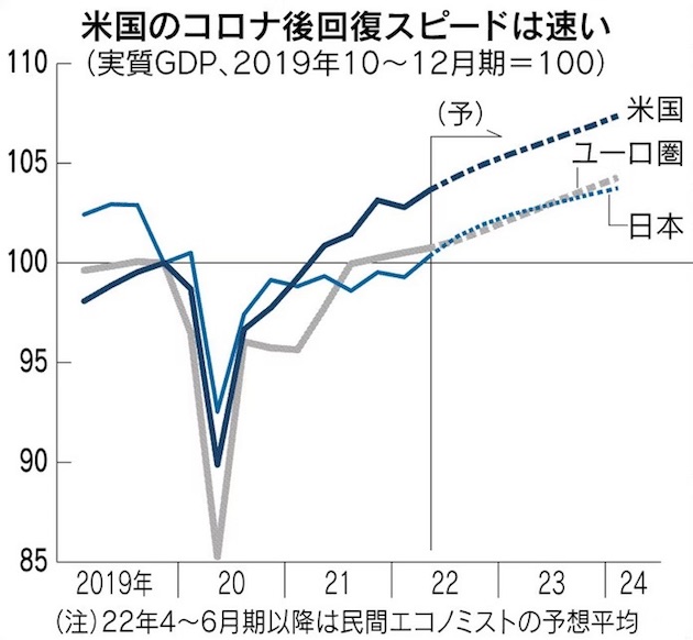日経新聞は5月19日付の記事で「日本経済(= GDP)はコロナ後の回復スピードがアメリカよりも1年遅れている」と報じています。