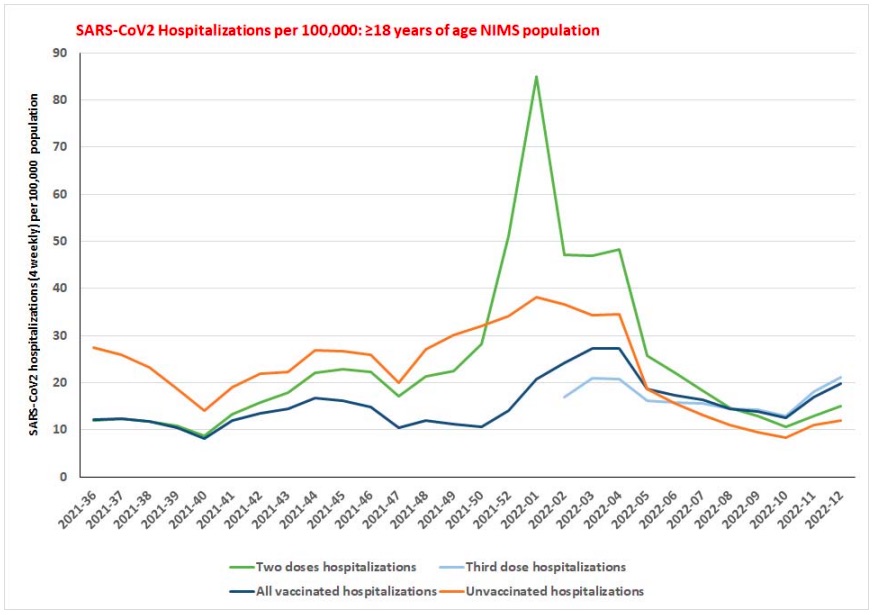 論文では「識別可能な有効性は認められなかった」と結論付けていますが、3回目接種者の陽性反応者・入院患者・死者が2回接種者や未接種者よりも人口比で多いことは無視できません。